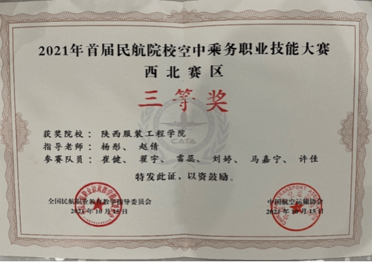 我校空中乘务专业在2021年首届民航院校空中乘务职业技能大赛中荣获团体三等奖。我校空中乘务专业在2023年第三届民航院校空中乘务职业技能大赛中荣获团体二等奖。